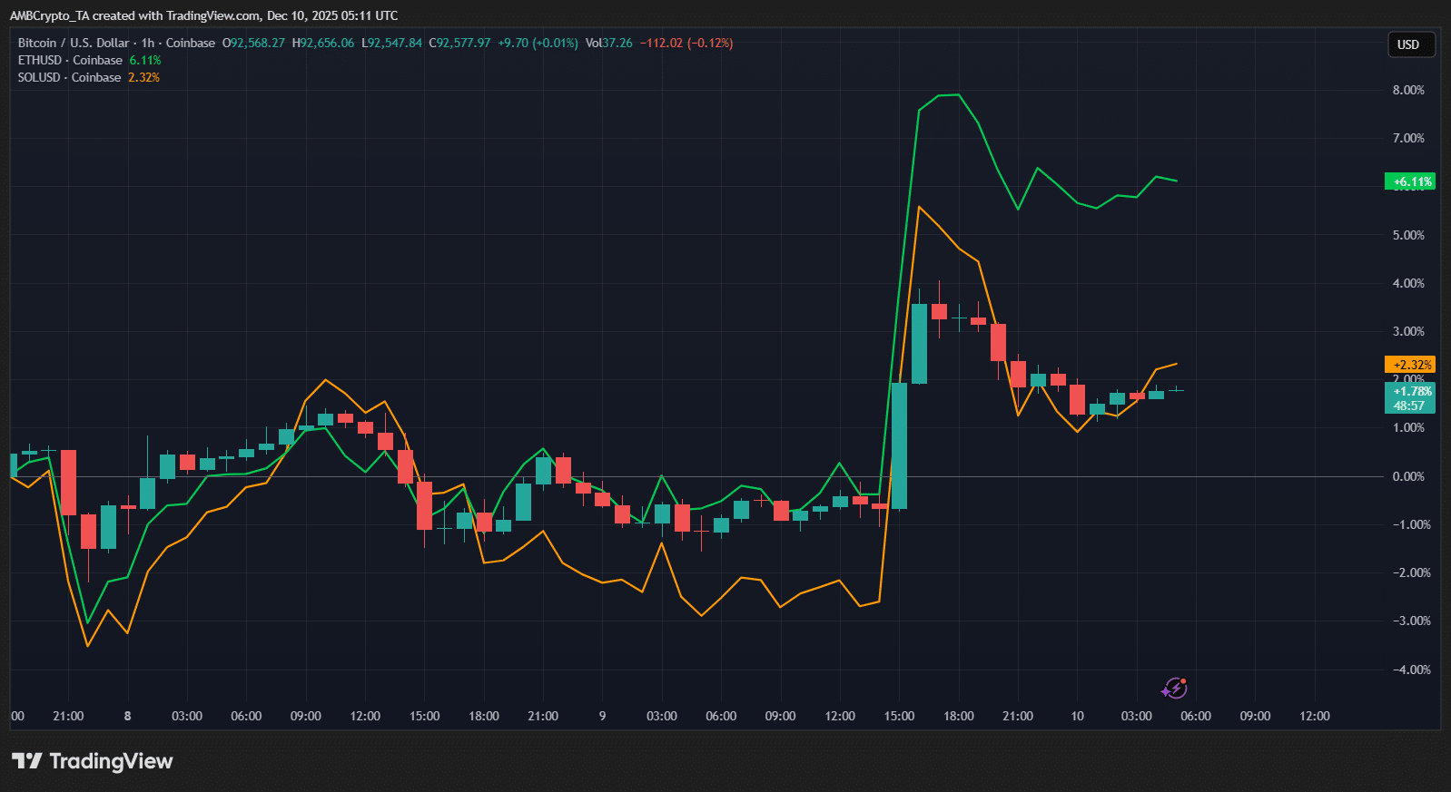 Ethereum [ETH] reacted the strongest among the majors, rising about 6.1%, while Solana [SOL] posted a 2.32% gain.