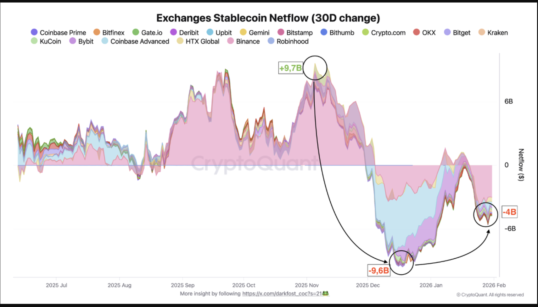 Furthermore, stablecoin flows into exchanges flipped sharply negative in late 2025, with 30-day net outflows reaching roughly $9.6 billion.