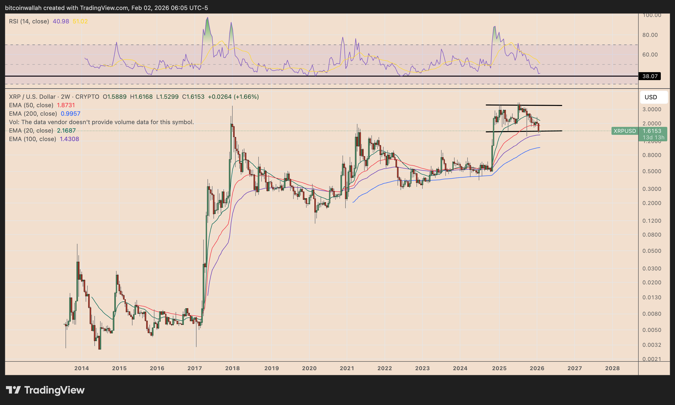 In any case, XRP may spend weeks finding its footing before attempting a stronger recovery by late Q1 or Q2 2026 if the RSI holds around 38 as it has throughout history.