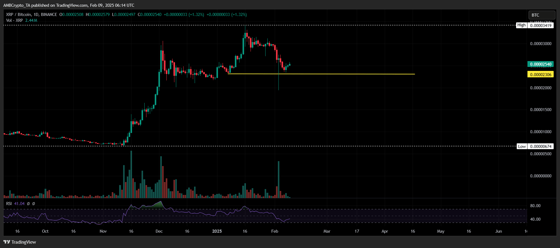 The XRP/BTC pair seems to follow this trend. Over the past three days, it has turned green, rebounding from the same support level that once sent XRP soaring to $3.40.