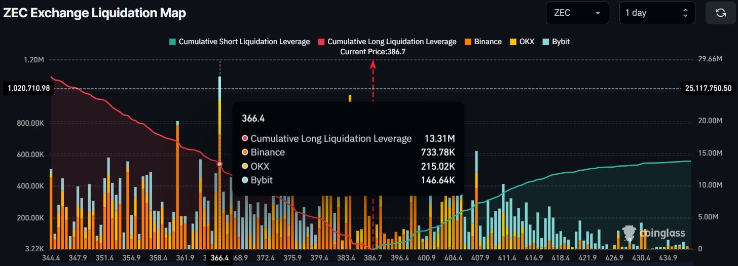 ZEC’s large liquidation zones sat at $366.4 on the downside and $407.4 on the upside. Those levels formed the intraday support and resistance range for derivatives traders.