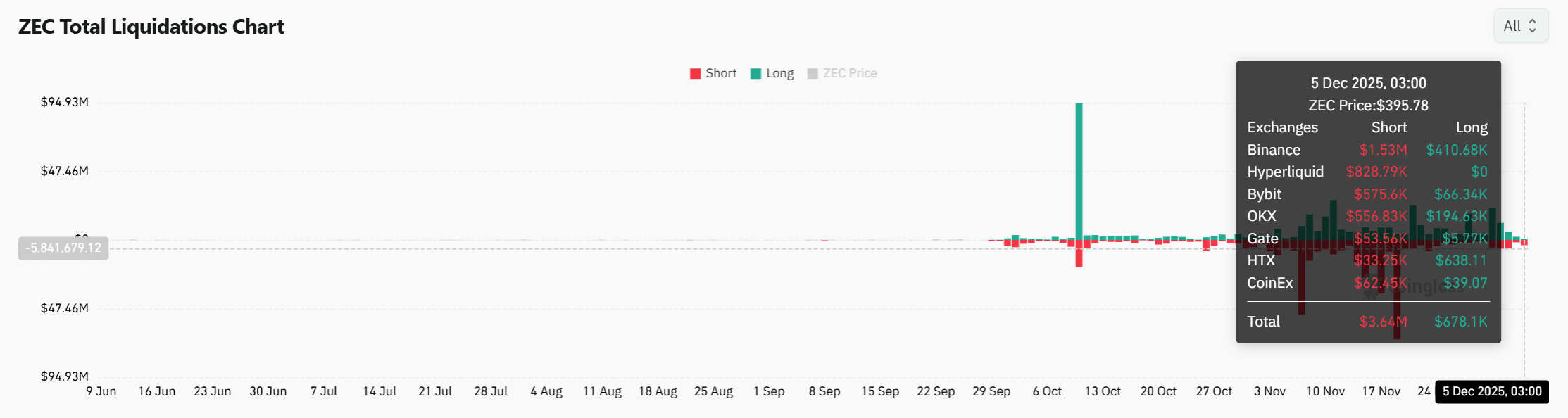 Additionally, reduced long-side liquidations reflect stronger demand and consistent dip accumulation as ZEC price climbs.